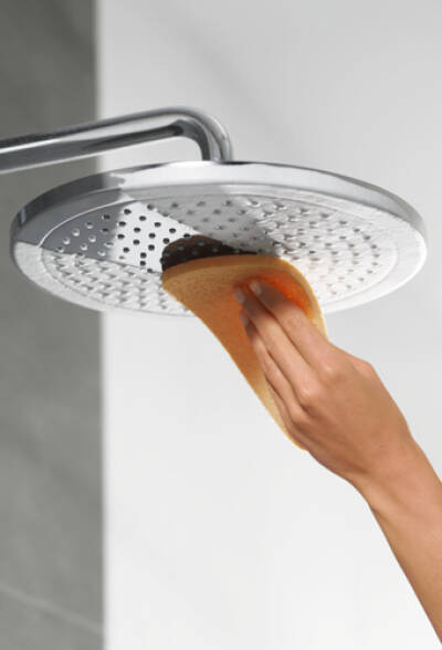 对于轻微结垢,我们的快速清洁技术提供了一种高效的解决方案来去除恼人的水垢。该技术集成在我们的龙头和花洒中,其特点在于喷淋喷嘴上的柔性硅胶喷嘴。只需用手指揉搓喷嘴,即可轻松去除水垢和污物。若花洒头上水垢严重,可使用柠檬酸来去除。将清洁剂喷在棉布上,小心擦拭龙头,或将花洒短时间浸入含有柠檬酸的水浴中,再用清水彻底清洗。