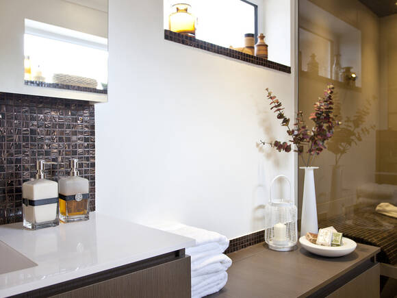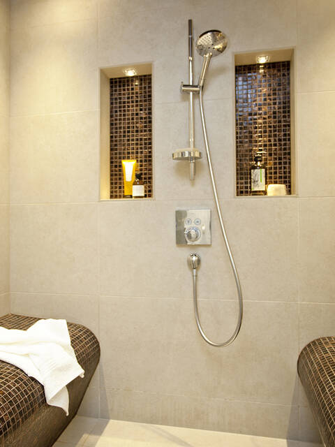 狭长空间直接通向宽敞的淋浴区。在深色玻璃隔断背后,配有闪亮镀铬花洒套装的小型养生区位于中央。汉斯格雅飞雨优选手持花洒带来多样化享受:通过三种喷淋形式。两个用棕色马赛克砌筑的座凳供人放松。淋浴场所与坡屋顶相接,天花板设计采用深色马赛克图案。以此打造充满舒适氛围并带来安全感的避风港。