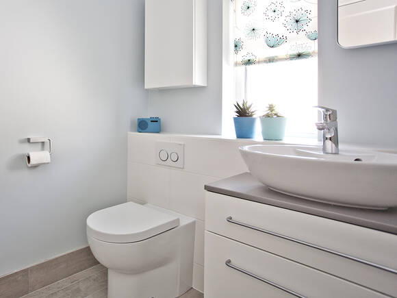 温馨的浴室在全新装潢或精心修缮的家中彰显个性。浅色内饰提升浴室的空间感。另外,给人凉爽之感的蓝色调配件营造清新氛围。实用装潢的鲜明线条烘托高档龙头的时尚典雅。