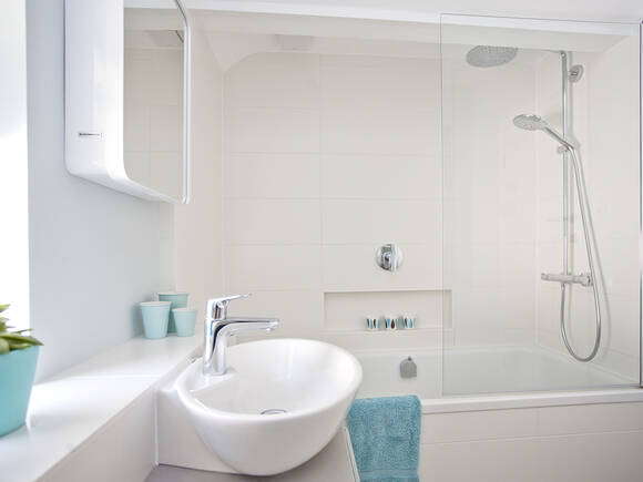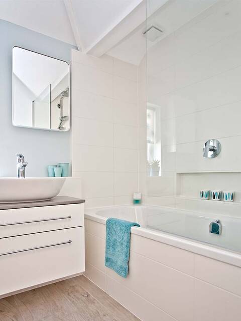 您想在有限空间内布置充满清新设计格调的温馨浴室?可选择浅色设计以增强日光效果和活跃气氛。纯白色与柔和的天蓝色相结合弥补了空间上的不足并增强坡屋顶下的空间感。节省空间的设计将浴缸与淋浴区相结合。直线造型与现代功能是装潢的基调。淋浴配件放置在狭长的墙面壁龛内,质朴的浴室家具确保台盆旁井然有序。白色瓷砖和椭圆形台上碗盆属于传统浴室设计元素。清新的蓝色调装饰元素和闪亮的镀铬龙头成为经典背景下的吸睛之作。