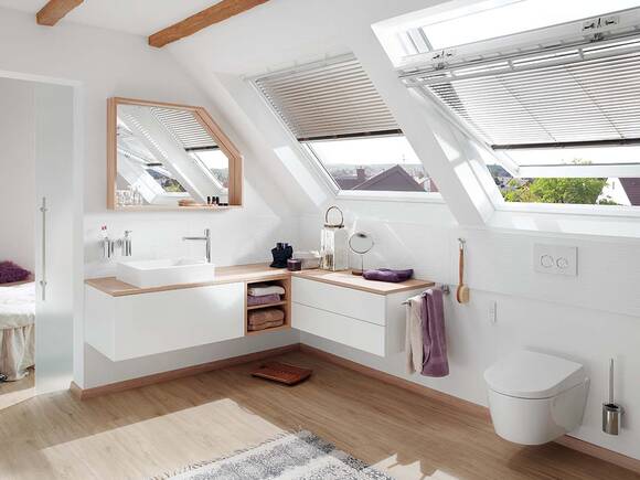 你想在你的新房里打造一间舒适的浴室吗?利用所有空间去创造出一间带有艺术家工作室风格的浴室,首先纯白色的墙面或利用白色瓷砖装饰的墙面搭配上地板自然的色调增强了阳光照射的效果,在舒适的室内,轻巧的装饰会很实用,带有木饰的浴室家具、自然色调的配件和质朴的地毯凸显鲜明的个性化几何造型。大窗户缓解了坡屋顶的压抑感并将自然风景纳入房间,与卧室的开放式连接将生活区融合并突出家居特性。