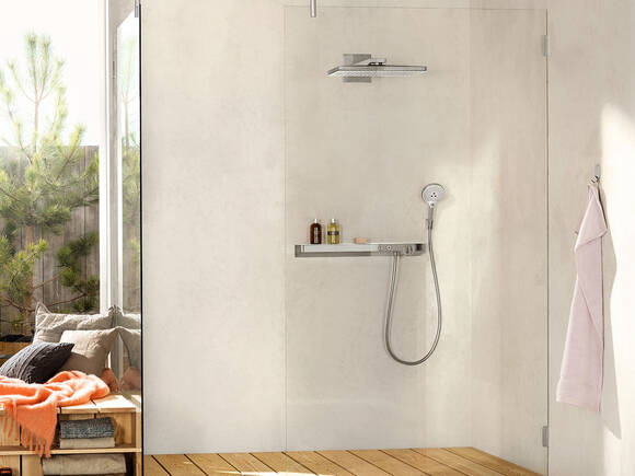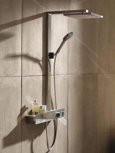 飞雨 Select E 或飞雨 Select 是为您的浴室精心设计的淋浴系统。其中包含头顶花洒、手持花洒和可以直观操作的恒温龙头。可通过按键从最多六种喷淋模式中选择:三种来自头顶花洒,三种来自手持花洒。飞雨淋浴系统采用镀铬表面、白色/镀铬表面或典雅的玻璃表面(飞雨 E)。