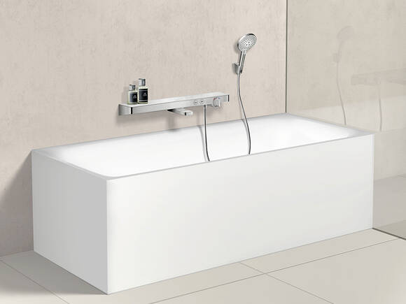 ShowerTablet 是灵活的明装恒温龙头,用于淋浴房和浴缸,配有宽度在 300 至 700 mm 的实用置物台面。其光滑的表面采用镀铬镜面处理或清新的白色/镀铬组合。这样的高档设计不仅看起来高贵典雅,还易于保养、坚固和耐刮擦。最大尺寸的 ShowerTablet Select 700 具有构建空间的特性,并且与大型淋浴房搭配特别和谐相融。